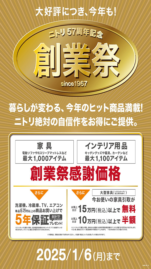 | ・ | 【ニトリアプリ会員限定】 商品合計5,000円(税別)以上のご購入でニトリメンバーズポイント 500Pプレゼント! |