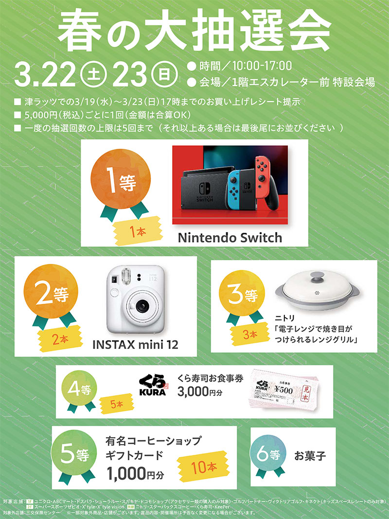 津ラッツでの3/19(水)~3/23(日)17時までのお買い上げレシートが対象です。