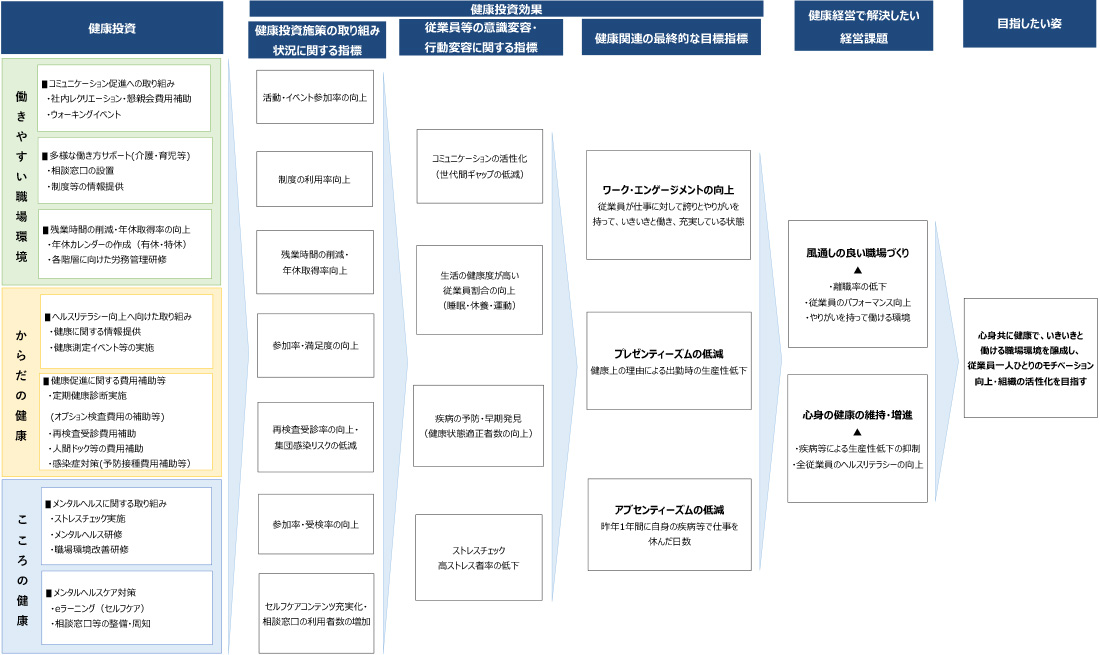 健康経営戦略マップに基づき、今後目指したい姿と健康関連施策とのつながりを見える化し、各種取り組み状況の指標・目標を設定し、心身共に健康でいきいきと働ける職場環境を醸成し、従業員一人ひとりのモチベーション向上・組織の活性化を目指す取り組みを進めてまいります。