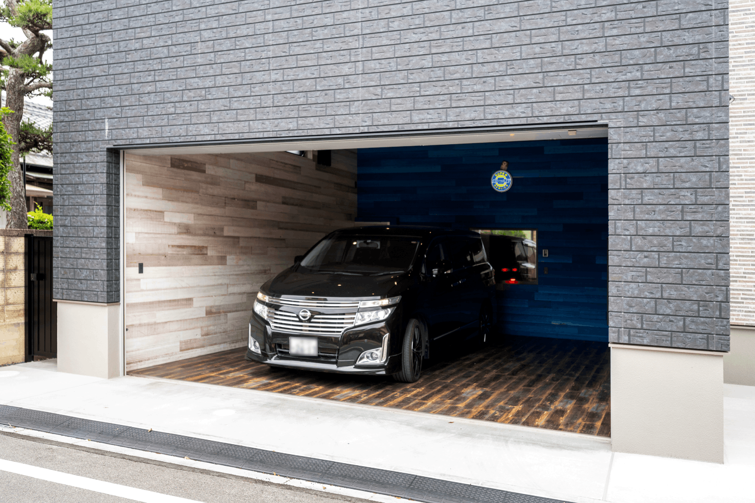 ガレージの床、壁、天井の板張りをF様のお父様ご自身で約2,3週間かけて施工したそう。完成まで当社担当者もどのようなガレージが出来上がるか楽しみにしており、完成したガレージは想像以上に華やかな空間となりました。