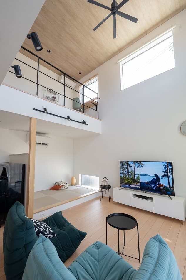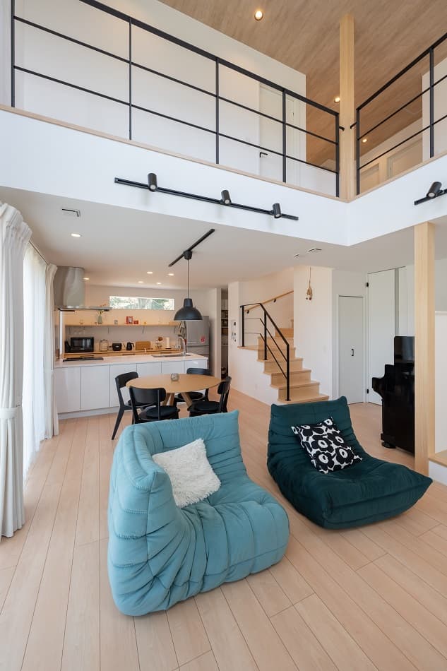 吹き抜けのあるリビングは大きな窓から自然光がたっぷりと注ぎ、開放感あふれる居心地の良い空間に。リビング階段が家族の気配をやさしくつなぎ、日常の中で自然なコミュニケーションが生まれます。