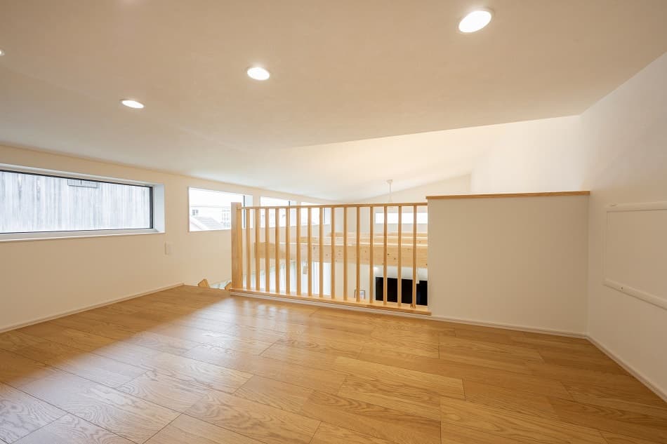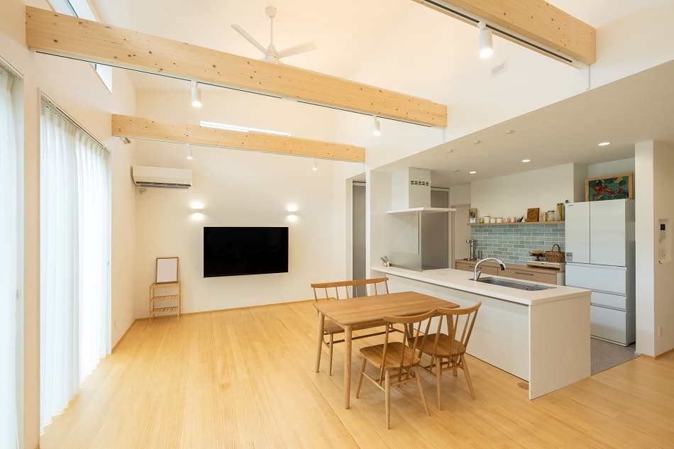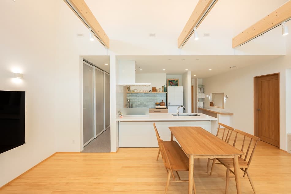 リビングには勾配天井を採用し、高窓から差し込む光が時間の移ろいを感じさせます。白と自然素材を基調とした内装は、清潔感と温もりを両立。大空間LDKは、家族の会話が自然と生まれる心地よい場所となっています。