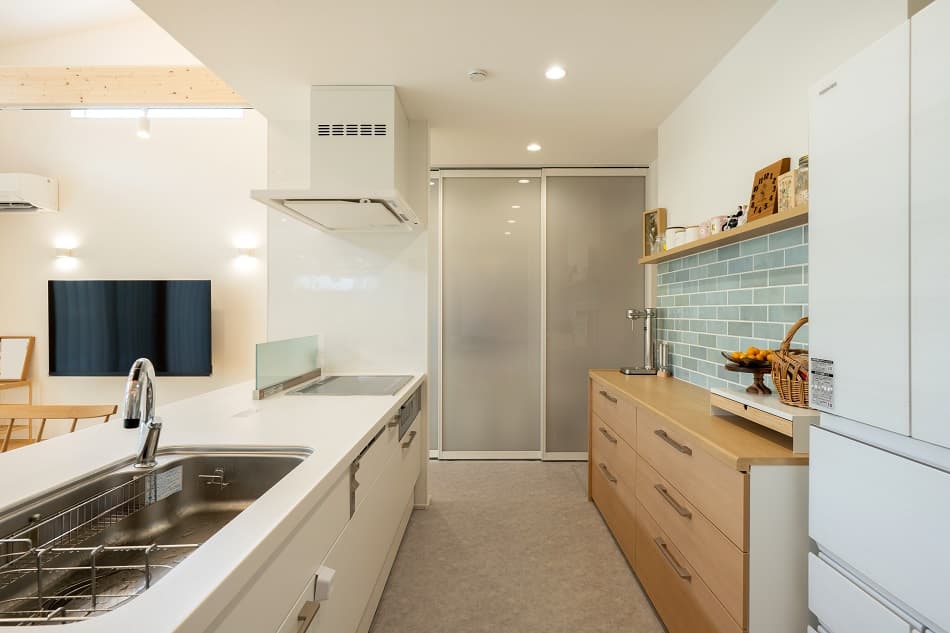 キッチンにはハンドメイド風のタイルとモダンな収納扉を採用し、デザイン性と機能性を両立しました。