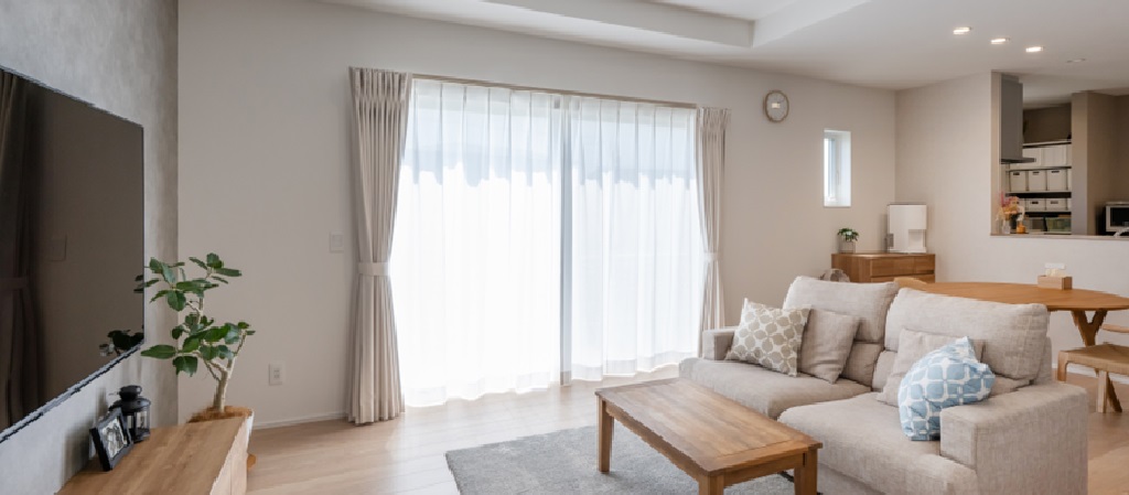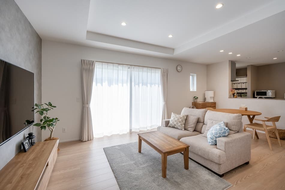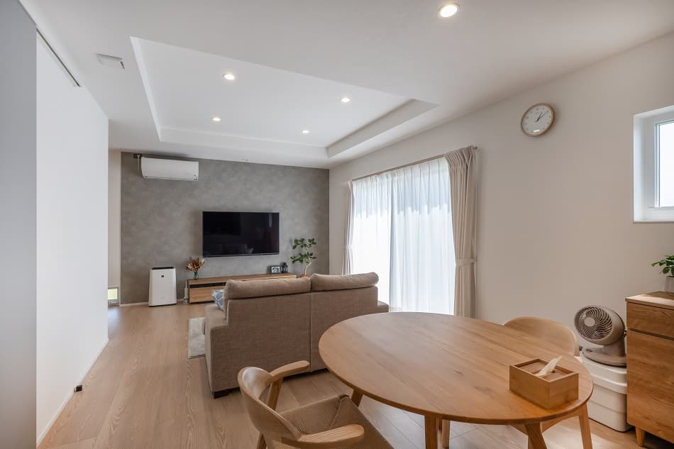 リビングは折り上げ天井によって視線が上へ抜け、開放感あふれる空間を実現しました。