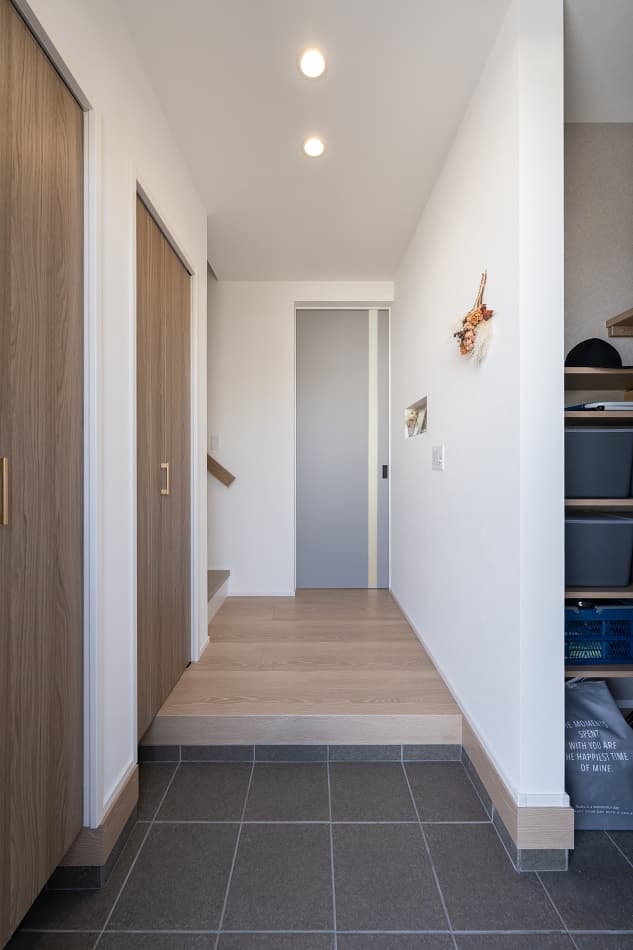 玄関には土間収納を設け、収納力を確保。外で使う物を気軽に収納できるため、室内を清潔に保つことができます。