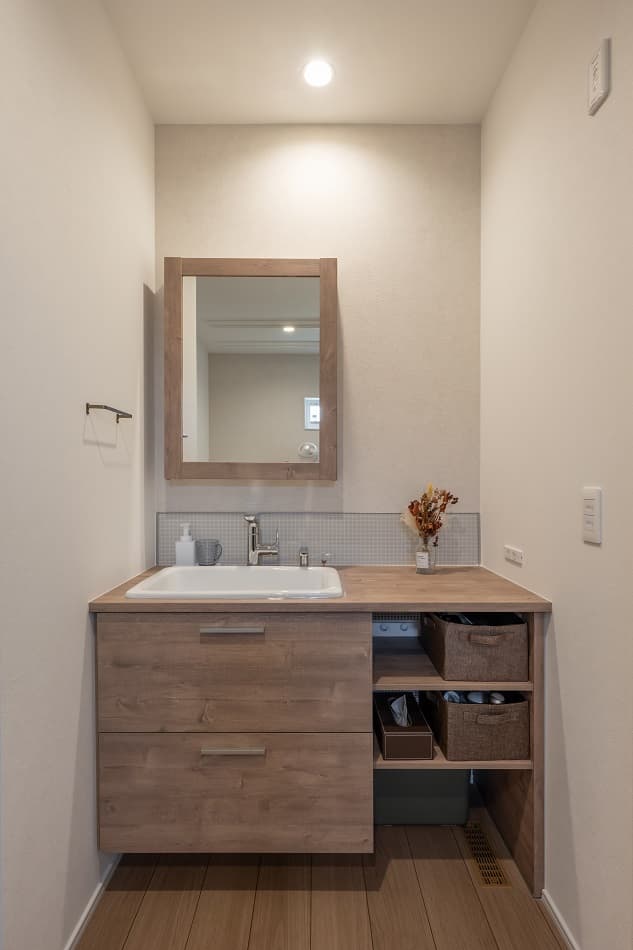 洗面スペースにはカントリー調の造作洗面化粧台を採用し、木の質感を活かした優しい雰囲気に。住まい全体のアクセントとしても印象的です。