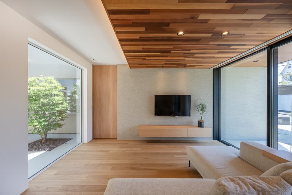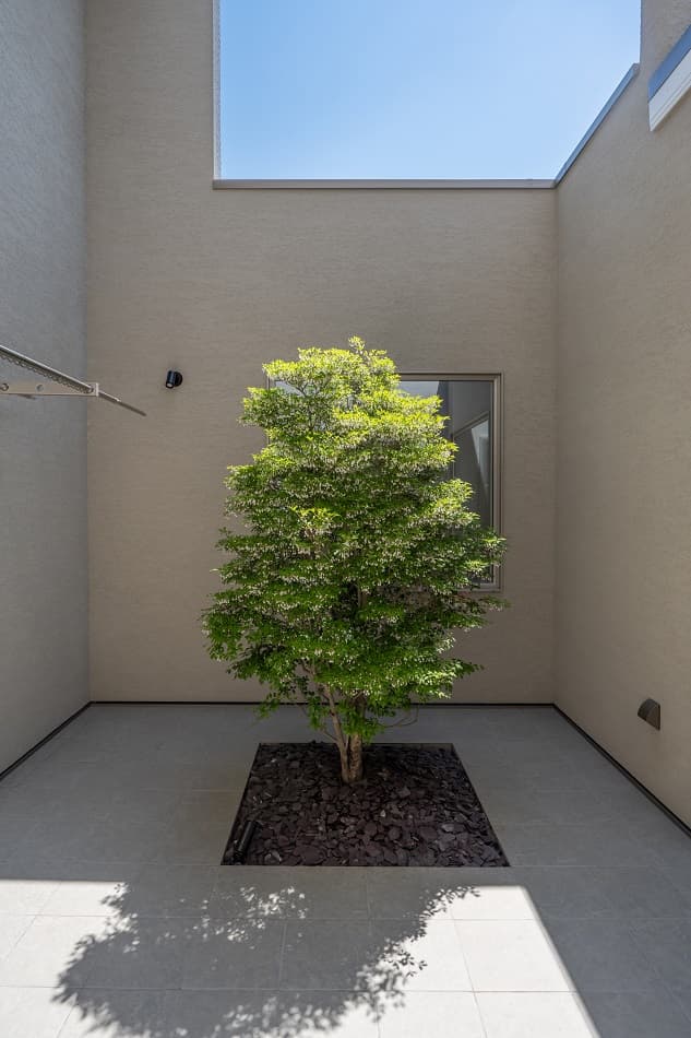 リビングには大開口サッシを設け、中庭と緩やかにつながることで、室内にいながら自然の光と風を感じられる開放的な空間を創出しています。外部からの視線を遮りつつ、プライベートな屋外空間も楽しめる設計です。