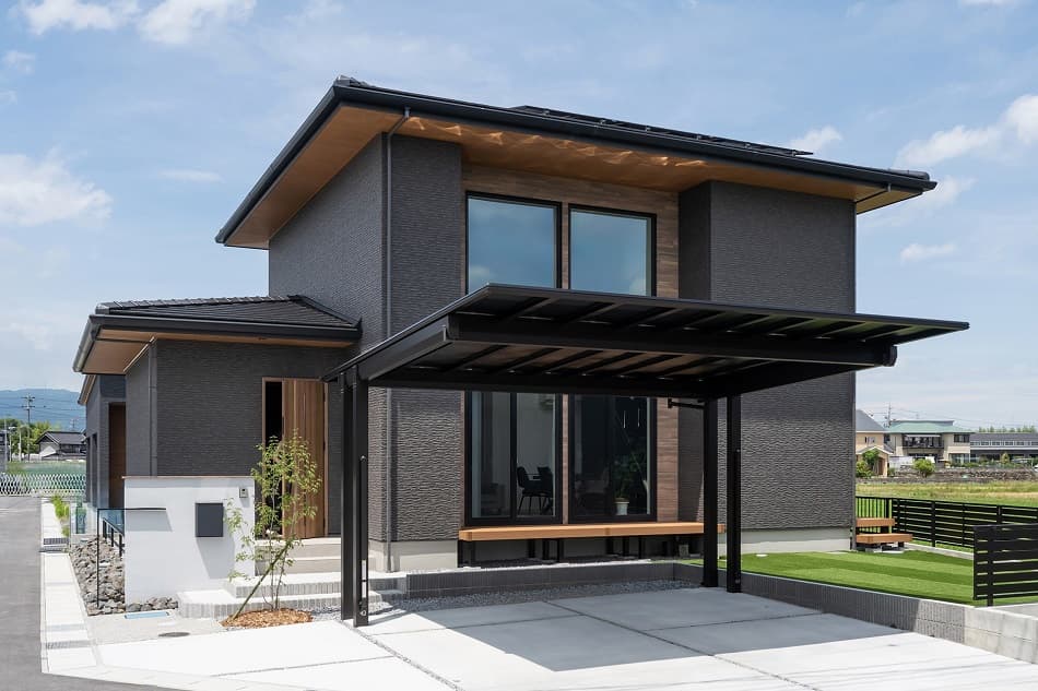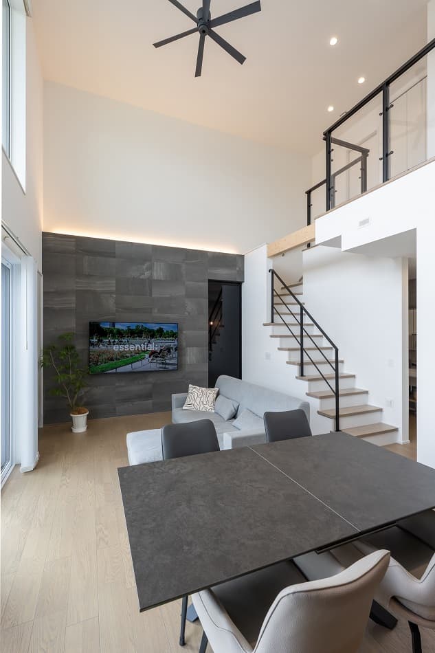 落ち着きある佇まいが魅力のA様邸は、深い寄棟軒によって生まれる陰影が外観に奥行きをもたらしています。ブラックの外壁に映える木目の意匠が、無機質になりがちなモダンデザインに温かみを加え、洗練された印象を演出。室内は吹抜けリビングを中心に構成されており、自然光がたっぷりと差し込む明るく開放的な空間が広がります。