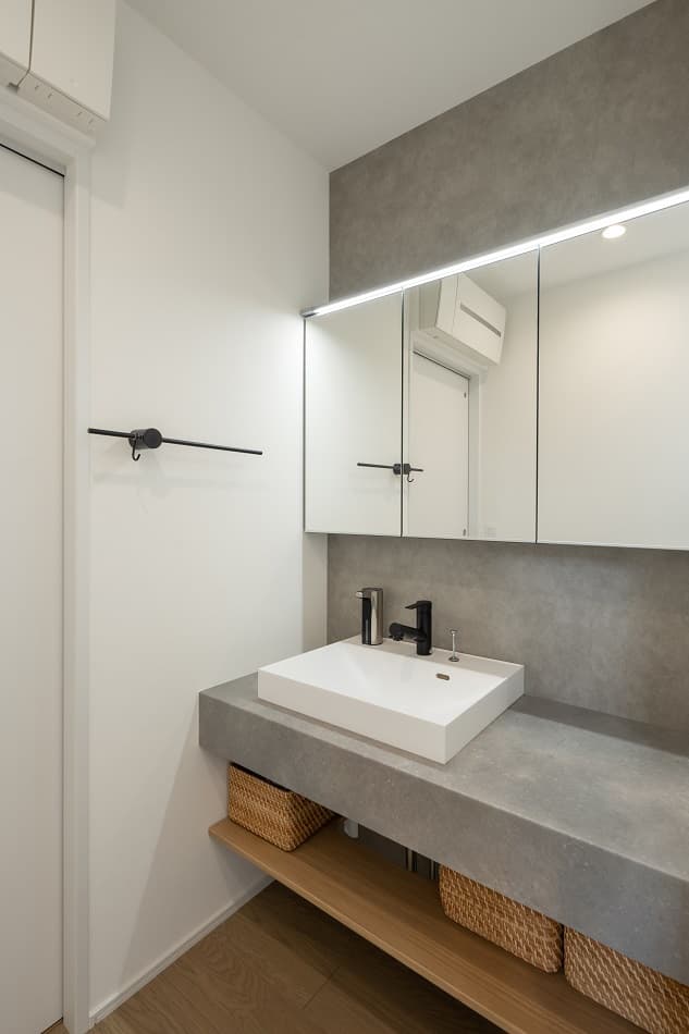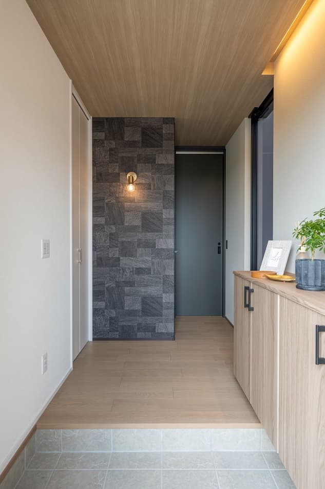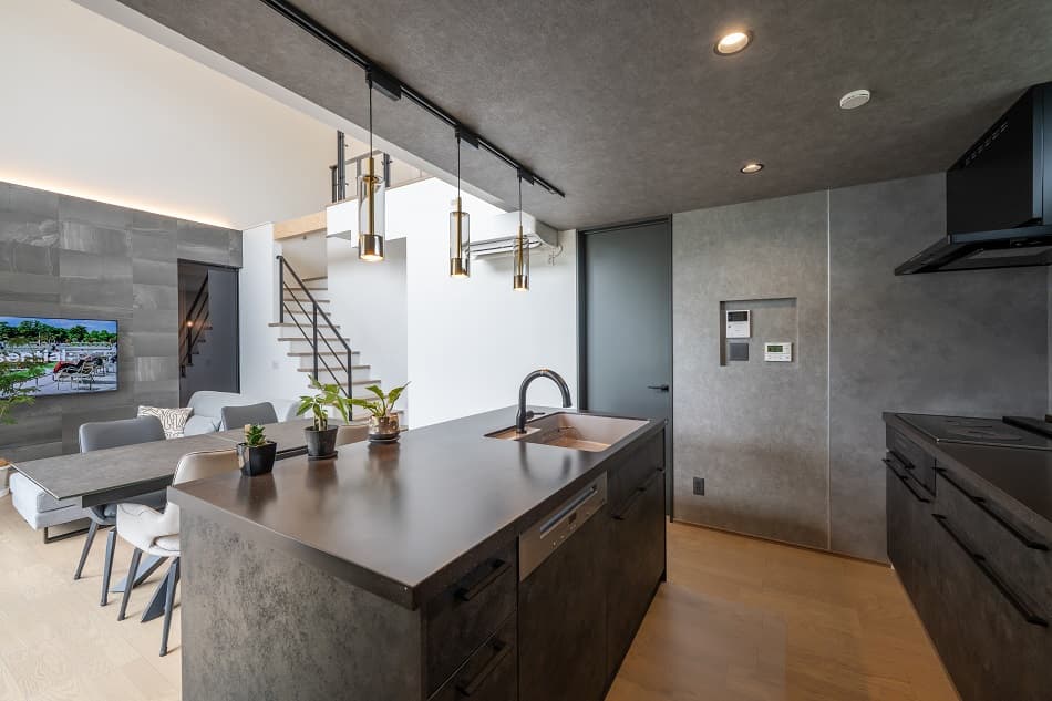 照明にもこだわり、時間帯やシーンに応じて異なる雰囲気を楽しめる工夫が施されています。LDKはブラックを基調とした統一感のあるデザインで、まるでホテルのような上質な空間に仕上げられています。また、家事動線は効率性を重視し、日々の作業をスムーズにする設計に。日常の中に静かな贅沢を感じさせる、心満たされるA様邸が完成しました。