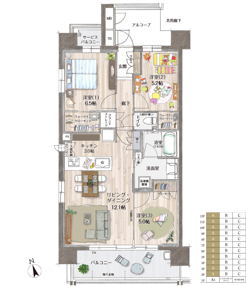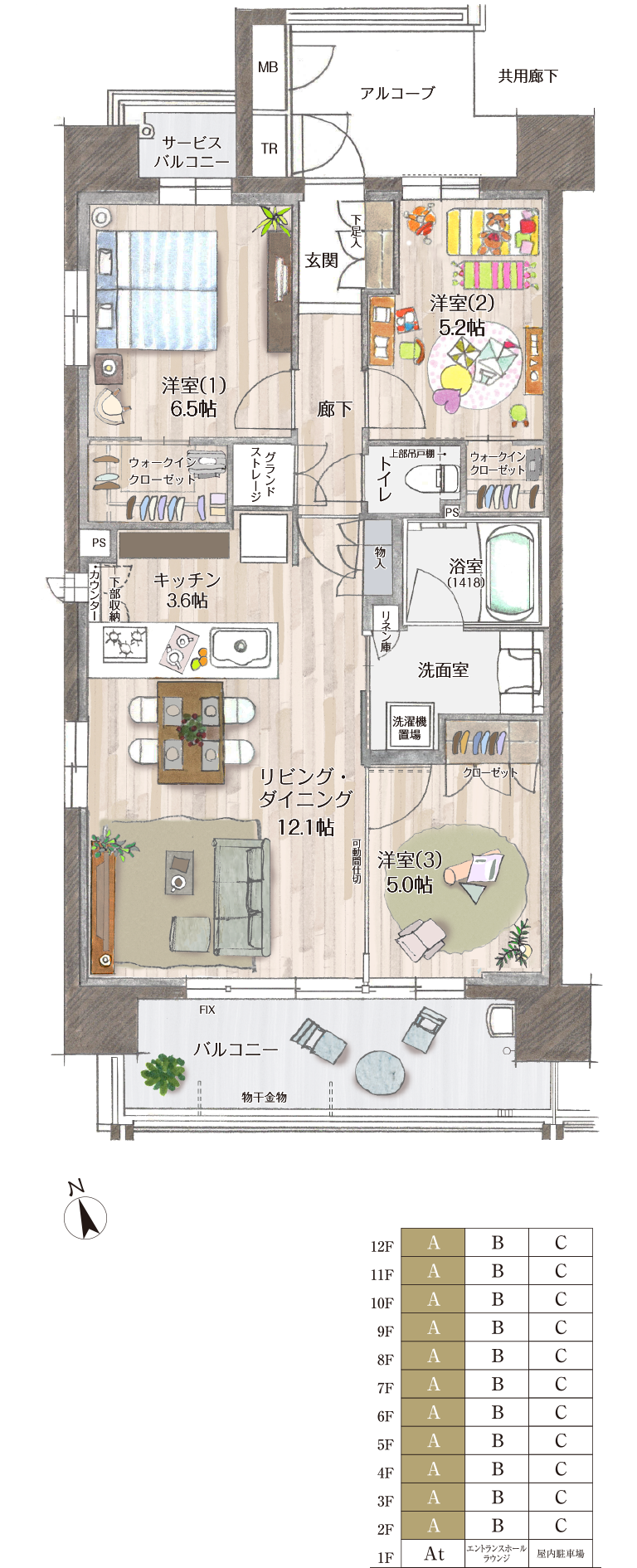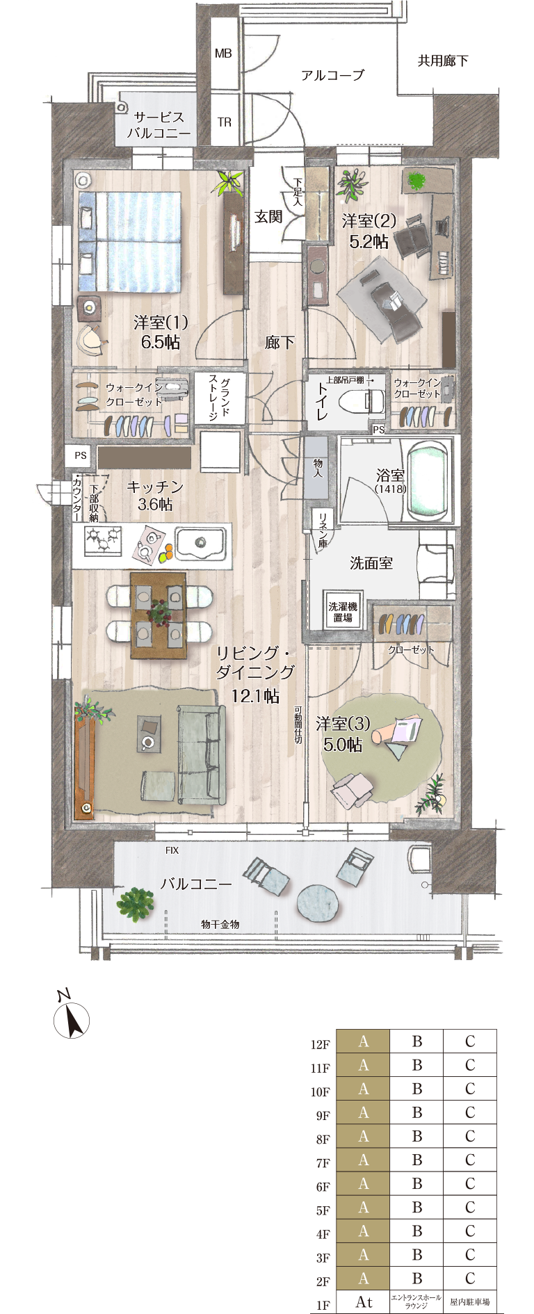 バルコニー面積:10.74㎡(約3.24坪)/ サービスバルコニー面積:2.10㎡(約0.63坪)/ アルコーブ面積:6.91㎡(約2.09坪)