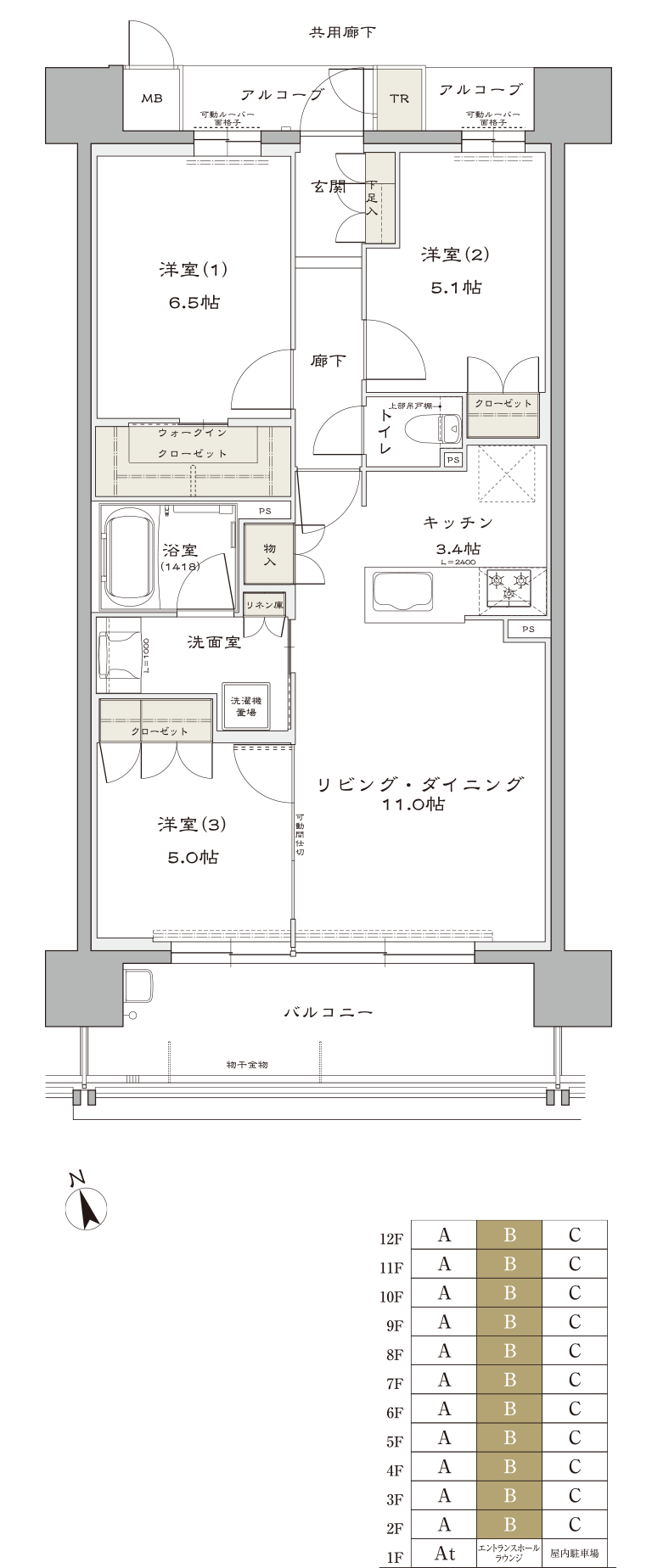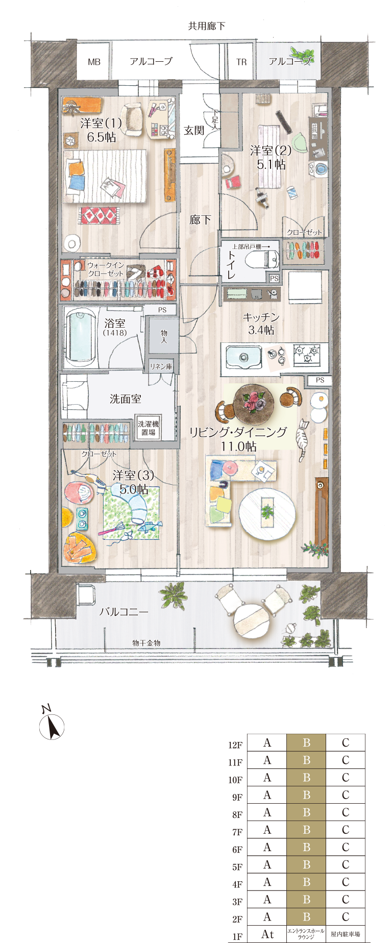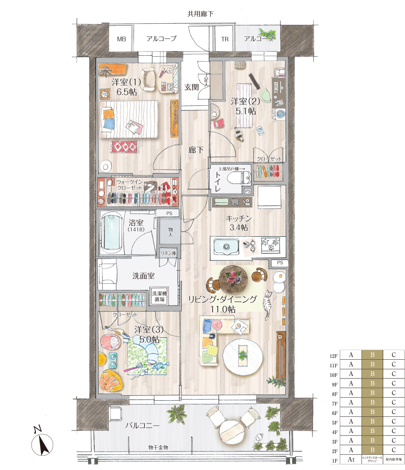 バルコニー面積:11.43㎡(約3.45坪)/ アルコーブ面積:4.18㎡(約1.26坪)