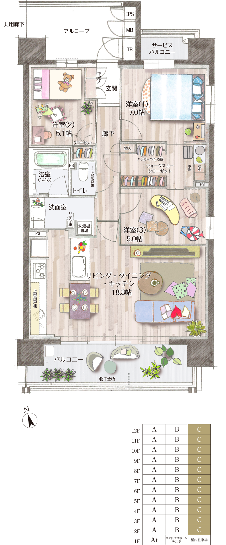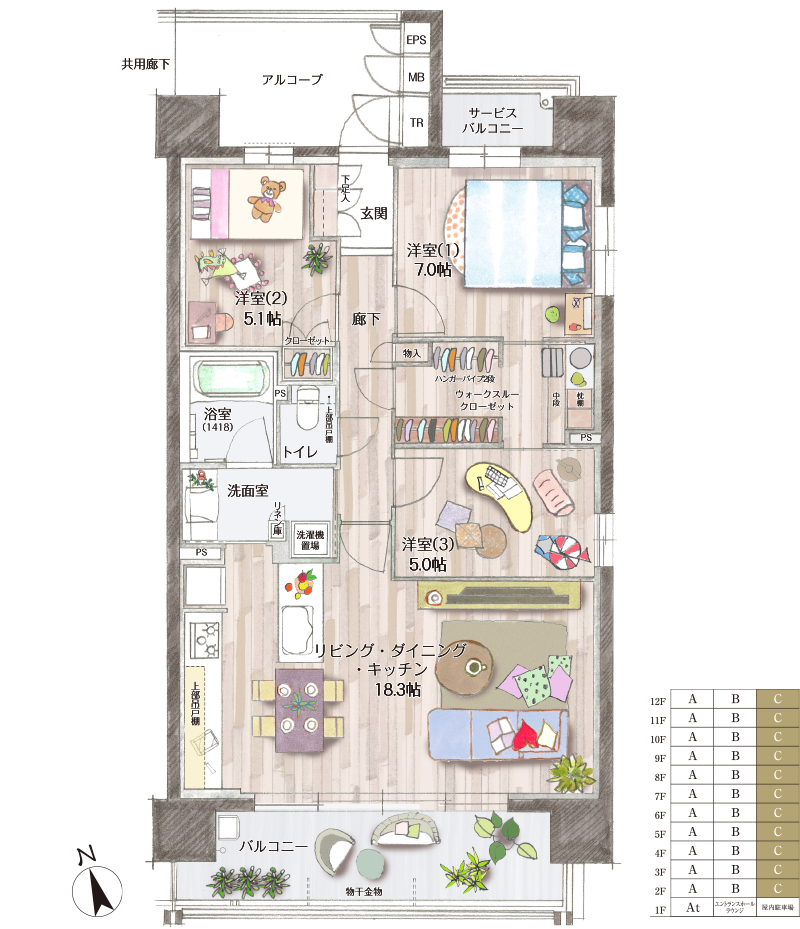バルコニー面積:12.00㎡(約3.63坪)/ サービスバルコニー面積:2.76㎡(約0.83坪)/ アルコーブ面積:8.74㎡(約2.64坪)
