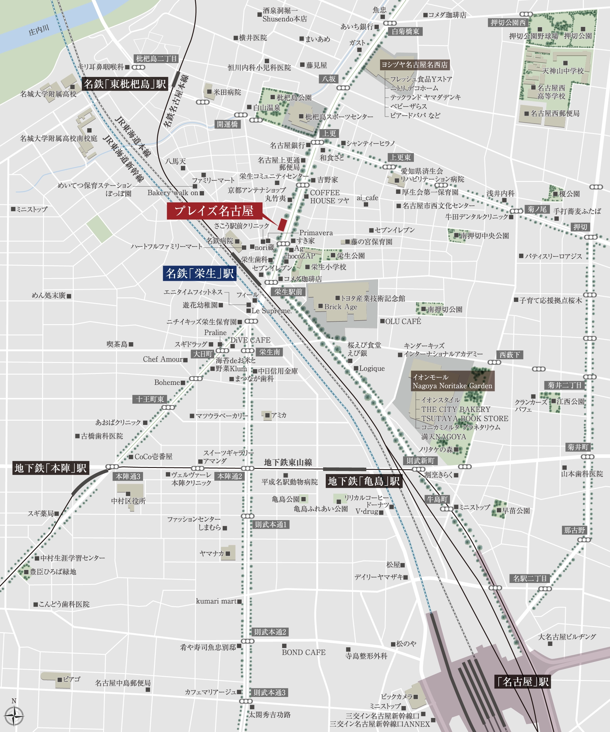 名古屋駅周辺※掲載の所要時間は待ち時間・乗り換え時間を含んだ通勤時(7:30~9:00到着)の最長時間を表したもので、時間帯により異なります。※徒歩分数は80mを1分、車の所要時間は法定速度を遵守して算出(端数切り上げ)した概算時間です。※時間帯・交通事情により変わる場合があります。