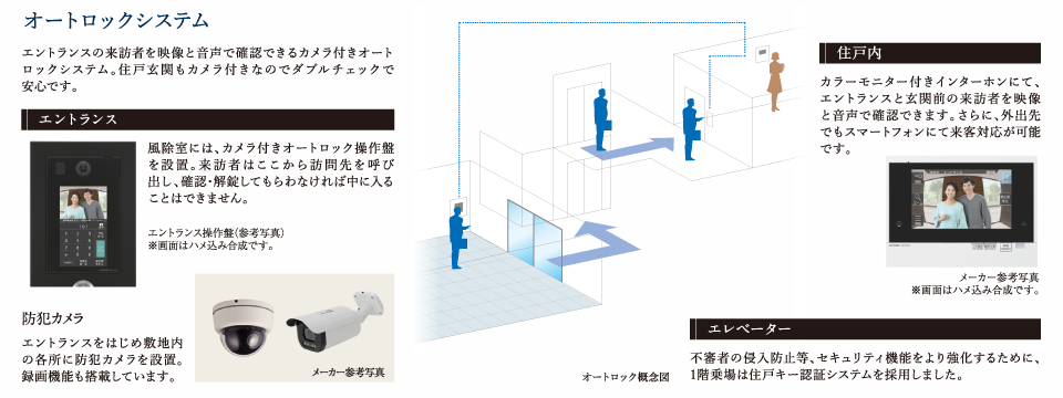 エントランスの来訪者を映像と音声で確認できるカメラ付きオートロックシステム。住戸玄関もカメラ付きなのでダブルチェックで安心です。
