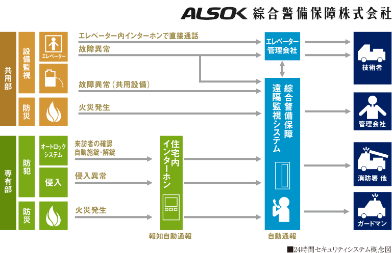エレベーターや給排水など共用設備部分のトラブルはもちろん、各住戸内の火災や、侵入などの異常を感知する、遠隔監視システムを設置。異常が起きた場合、警備会社に自動通報し、専門のエンジニアやガードマンが緊急事態にいち早く対応する安心のセキュリティシステムを採用しています。