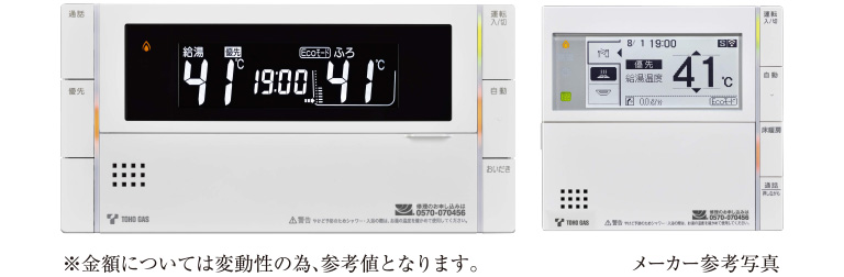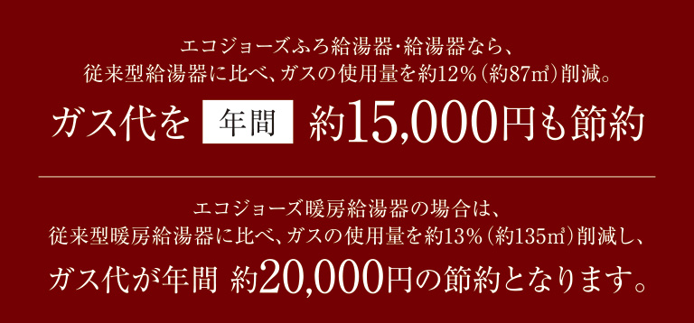 <試算条件>年間のエネルギー消費量(給湯、暖房)は、国立研究開発法人建築研究所が公開する「住宅に関する省エネルギー基準に準拠したプログラム」を使用して東邦ガスで試算。●ガス料金(東邦ガス):ふろ給湯器・給湯器の場合、従来型給湯器・エコジョーズともに一般ガス供給約款B。暖房給湯器の場合、従来型暖房給湯器は床暖トクトク料金標準プラン、エコジョーズは床暖トクトク料金エコジョーズプラン※1。従量料金単価は全て2025年4月時点。ガス料金は、原料調整費および、消費税等相当額を含む料金。基本料金は加算せず。●2025年2月から2025年4月までのガス・電気料金については、「電気・ガス料金負担軽減支援事業」の政府支援に基づく値引きが適用されますが、本カタログにおける光熱費の試算結果においては値引きを反映せずに試算しております。実際のご請求金額や料金単価およびメリット額とは異なる場合があります。