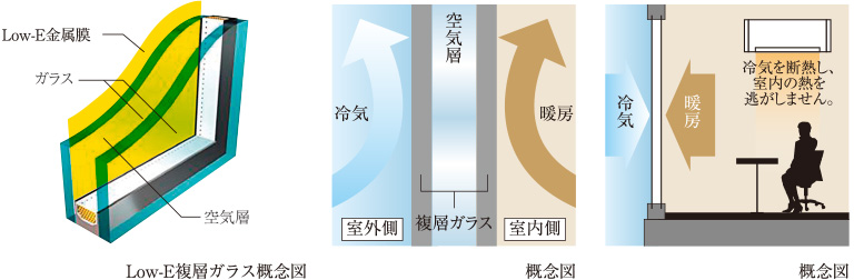 2枚の板ガラスの間に乾燥空気を閉じ込めて熱の貫流を抑制します。さらに、ガラスの表面にコーティングされた特殊金属膜を設けることで冷暖房効率が向上すると共に、室内外の温度差による結露の発生を抑えます。