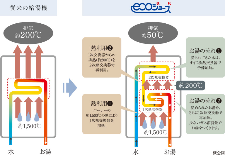 ガスの燃焼時に生じる排熱を再利用して、効率良くお湯を沸かせる経済的な給湯システム。