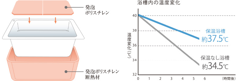 ※2当社FRP保温なし浴槽を単品にてJIS基準に基づき測定。※《湯温低下に関するご注意》浴槽内の温度変化は、JIS基準の条件での値です。ご使用の条件で湯温低下は異なってきます。以下の場合は、湯温がカタログ表示値より低下します。