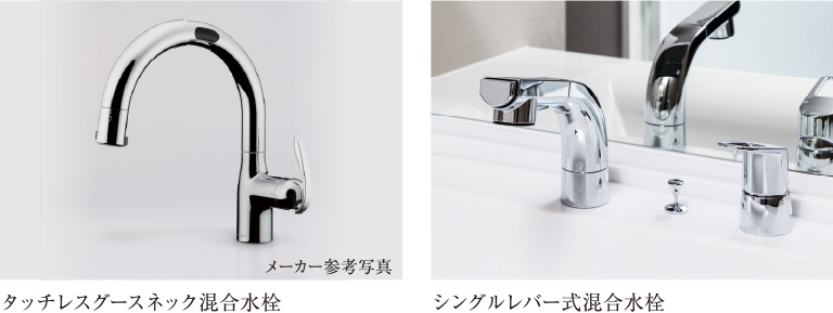 システムキッチン、洗面化粧台には節水・節湯タイプの水栓を採用。水の勢いは変えずに快適に節水・節湯できます。