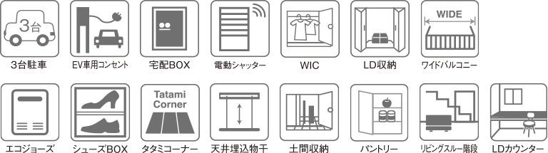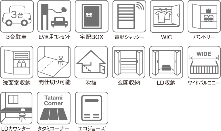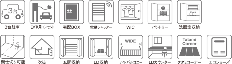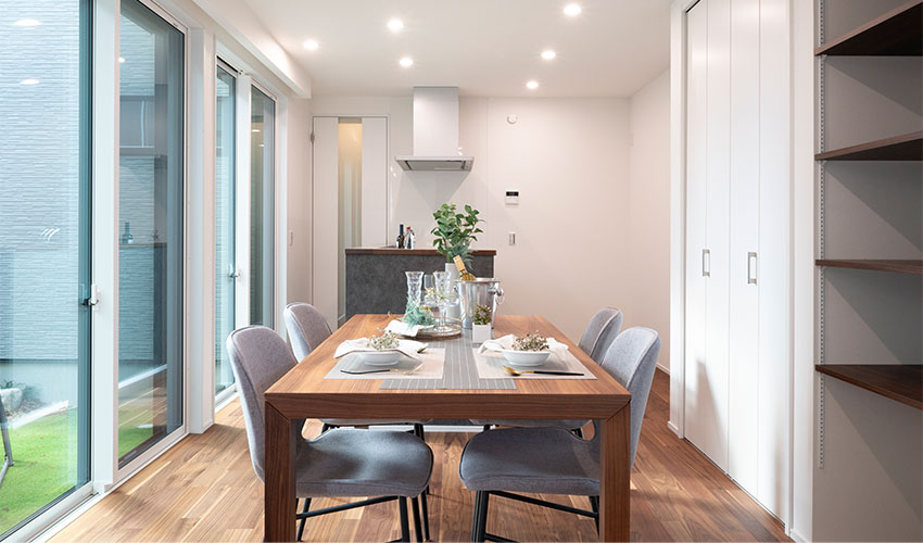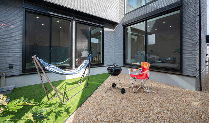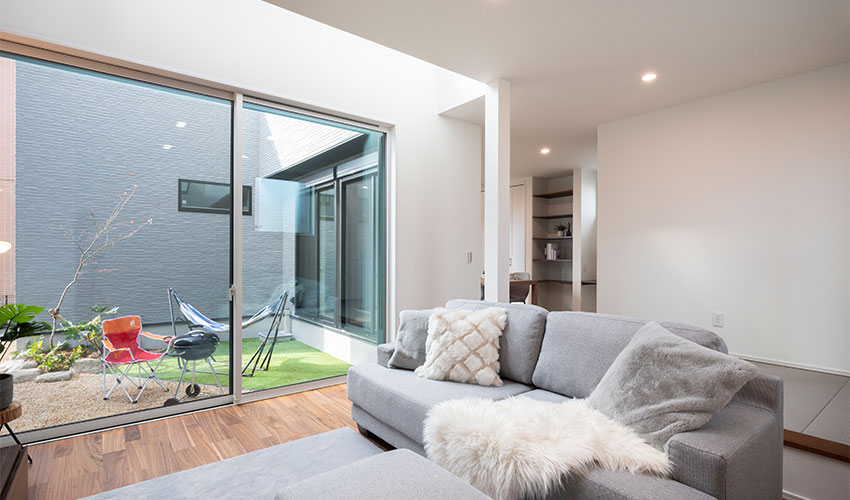 コの字型の中庭空間は、外から見えないプライベートな空間。 キッチンやダイニングから眺められる中庭や、吹き抜け空間で開放的な住まいに。