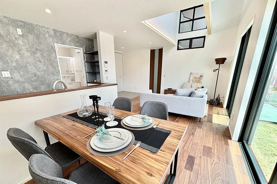 自然光が降り注ぎ、明るさと開放感を演出。大開口で庭とのつながりも感じられます。