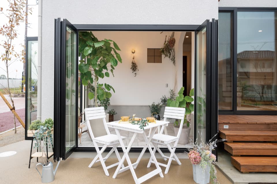 庭での食事や趣味をより楽しみやすいよう、リビングサイドに土間テラスを設けました。