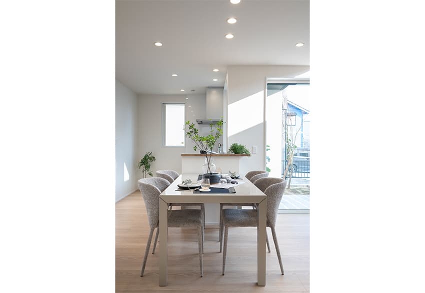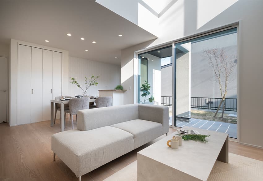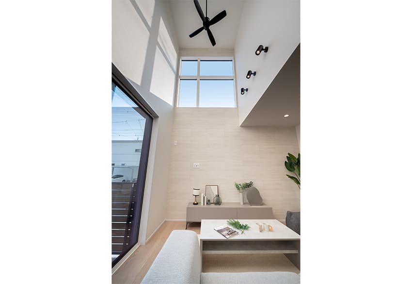 ワンフロアタイプのLDKは、吹抜けと土間テラスでさらに開放的に。