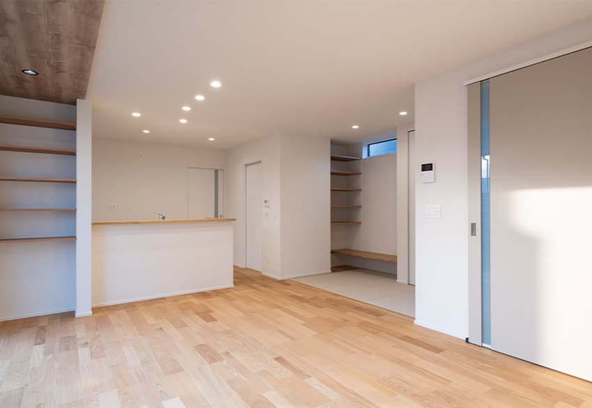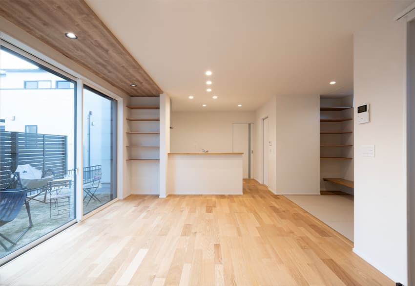 カウンター付きでプライベートな作業もできる、LDKの和の空間。