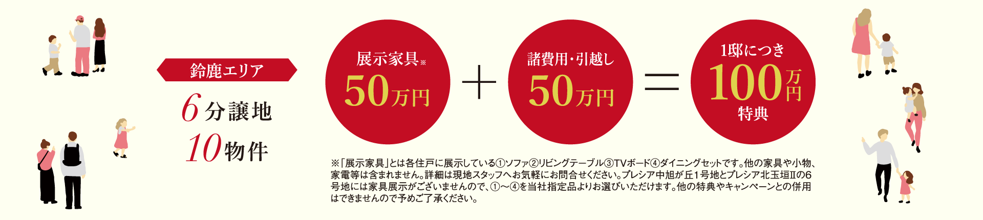※「展示家具付き」とは各住戸に展示している①ソファ②リビングテーブル③TVボード④ダイニングセットです。他の家具や小物、家電等は含まれません。詳細は現地スタッフへお気軽にお問い合わせください。杜の街5-33-4とプレシア中旭が丘1号地には家具の展示がございませんので、①~④を当社指定品よりお選びいただけます。(「選べる家具」と表記しています)他の特典やキャンペーンとの併用はできませんので予めご了承ください。※建物画像は全て現地撮影写真です。