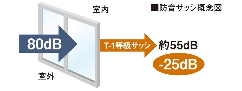 防音性を高める防音サッシを採用。車の走行音など戸外の騒音を抑えます。